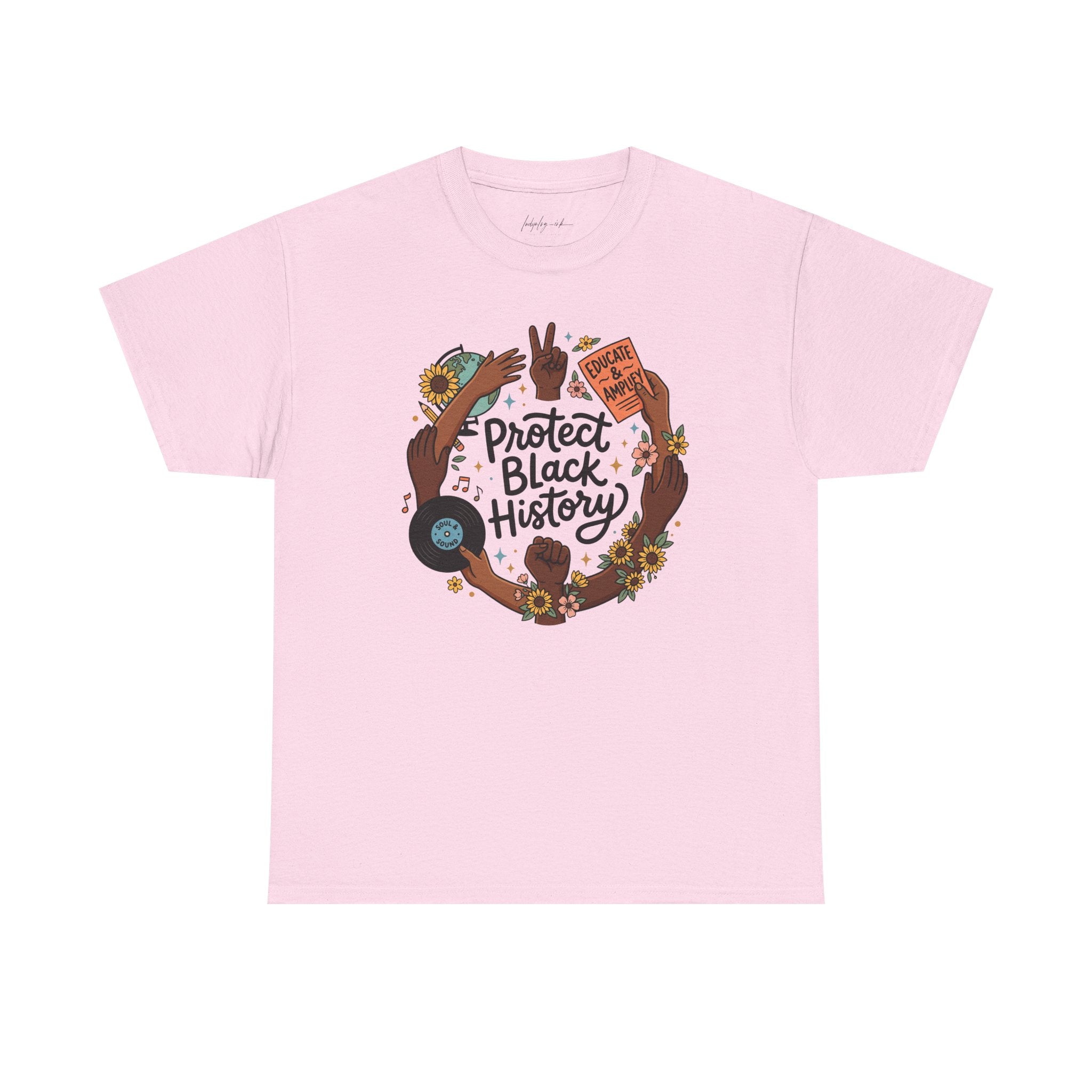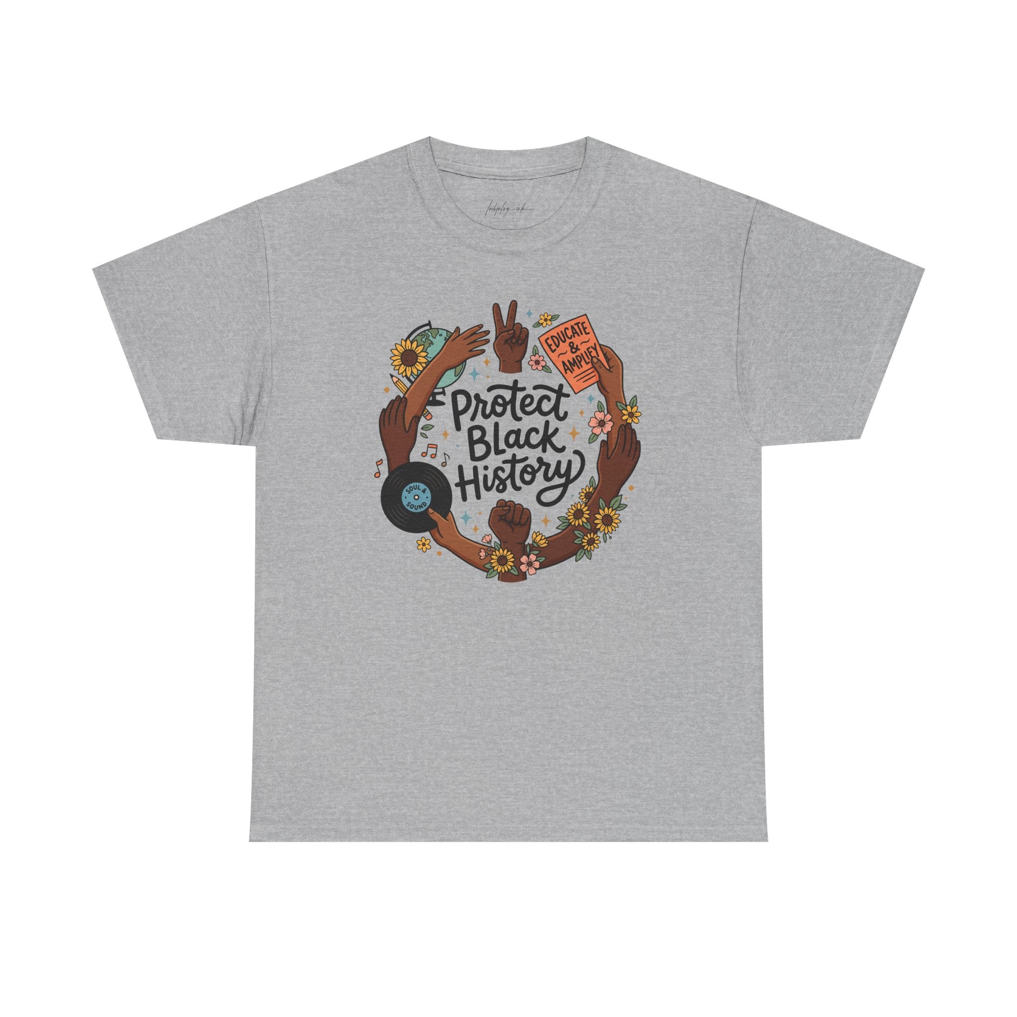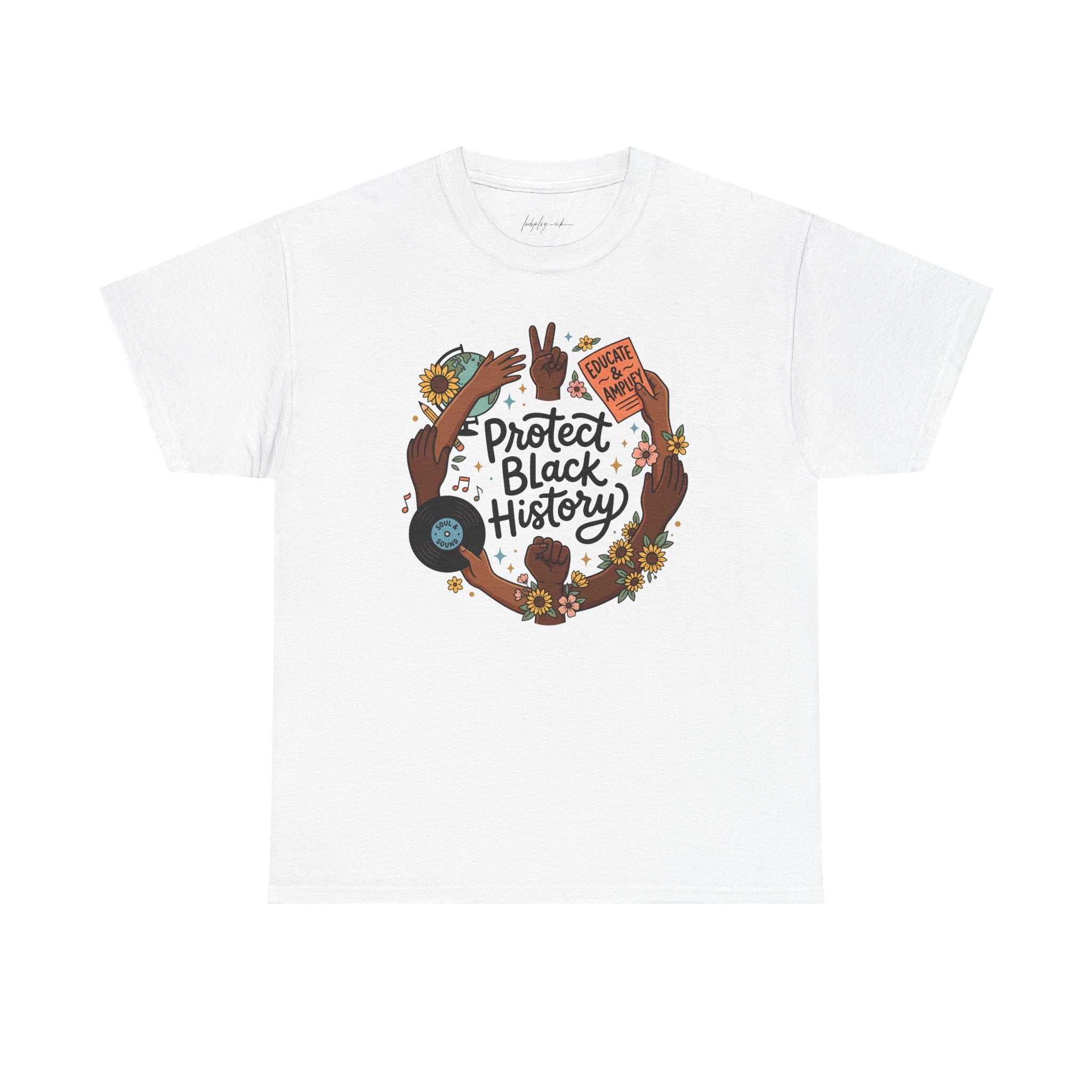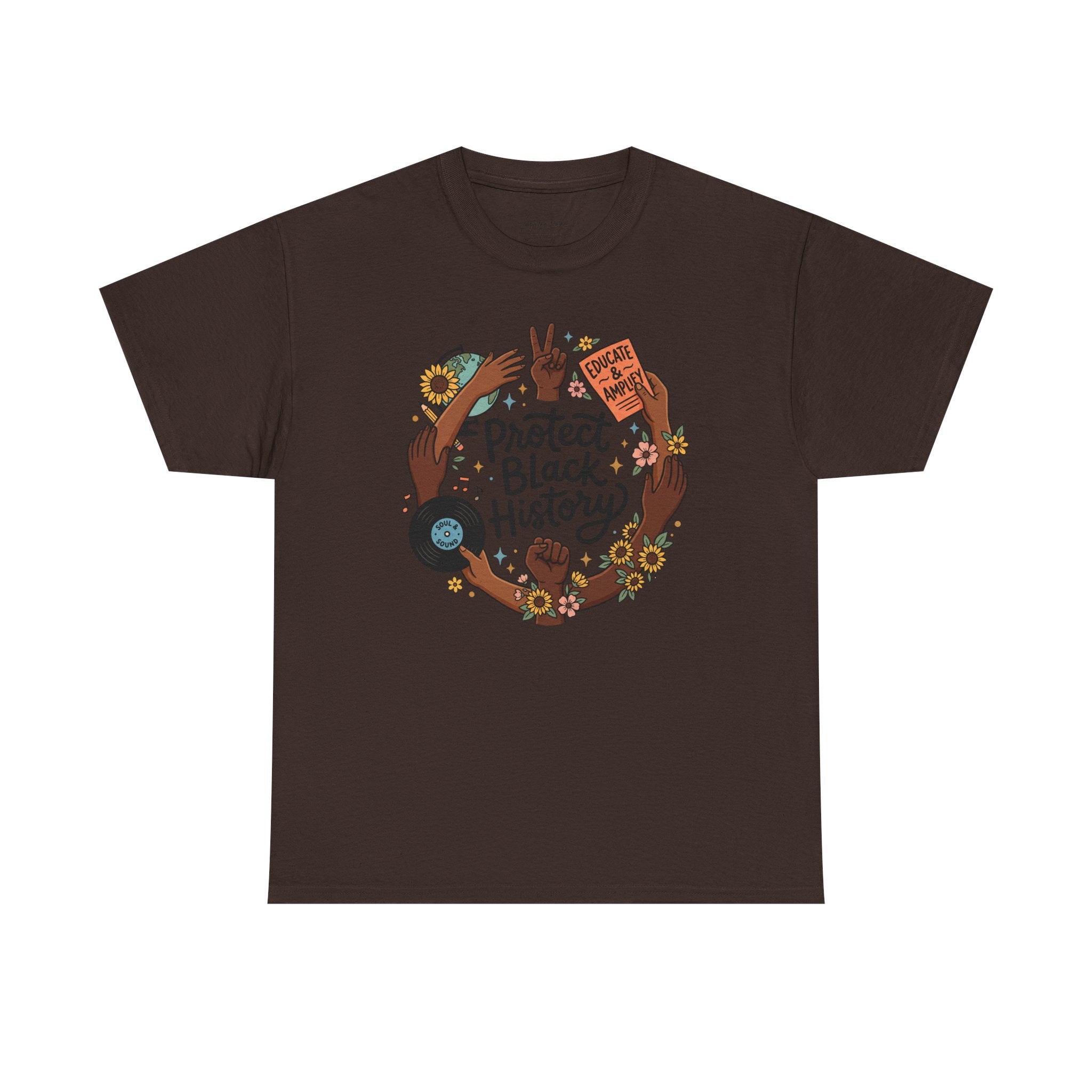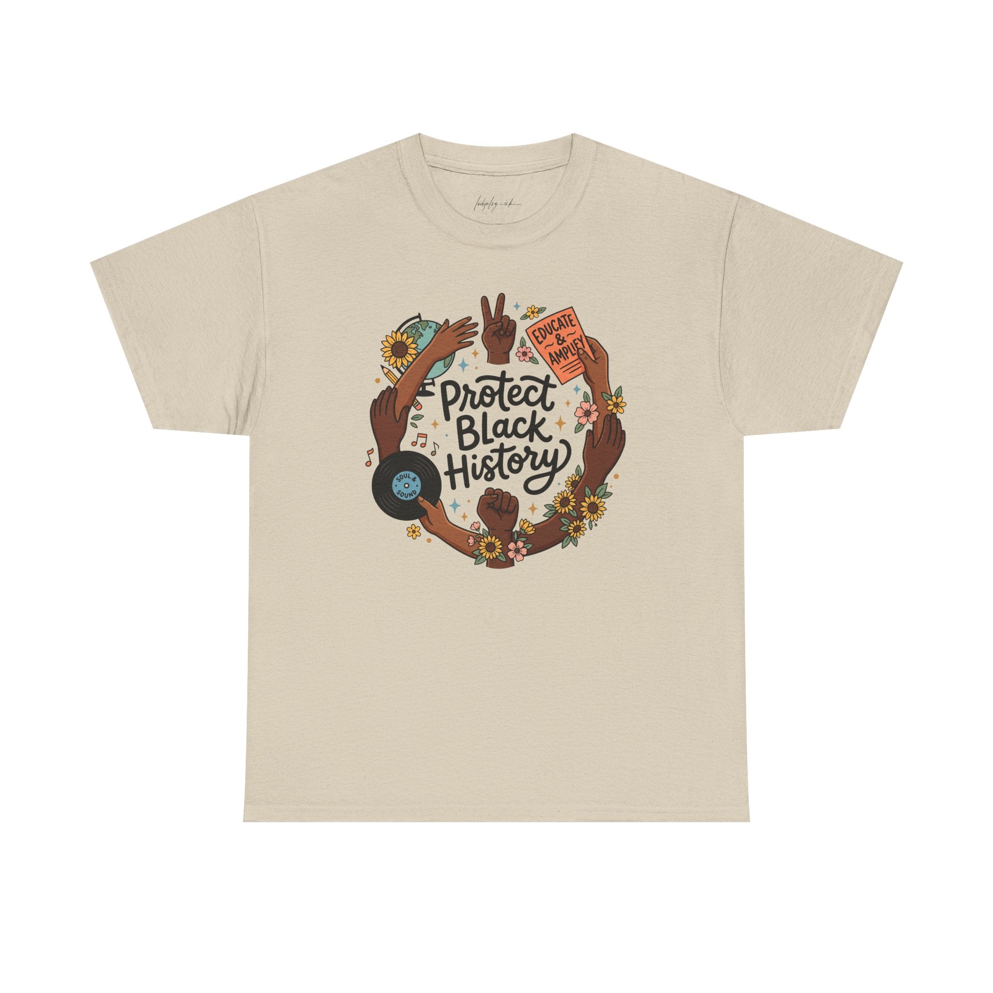 Soft, sturdy, and thoughtfully designed, the 'Rooted in History' tee carries a gentle yet powerful message of preservation. The artwork centers on a warm, handcrafted wreath of symbols—raised hands, vinyl records, and sunflowers—that frame the words 'Protect Black History' at its heart.